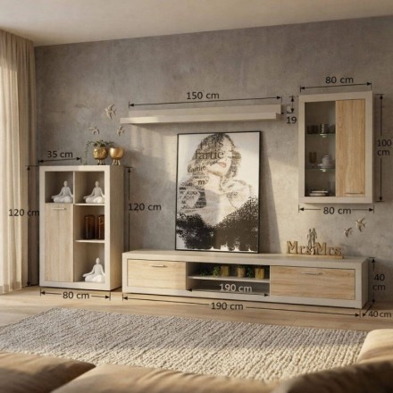 Incluye bajo TV, columna a suelo, vitrina colgante con LED interior y estante de pared.
