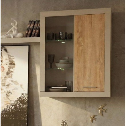 El módulo alto colgado con vitrina incorpora iluminación LED interior, ideal para resaltar objetos decorativos y aportar un ambiente acogedor al salón. El conjunto se completa con un estante de pared de 150 cm, perfecto para libros, marcos o elementos decorativos.