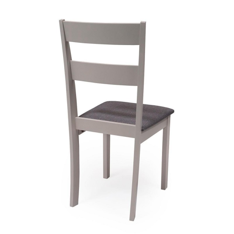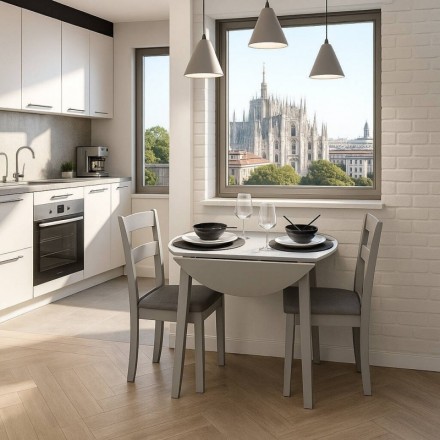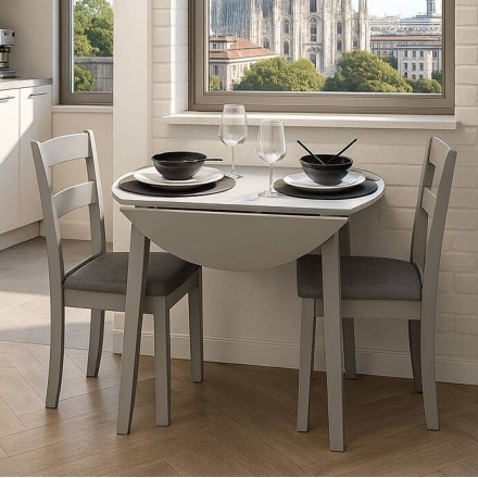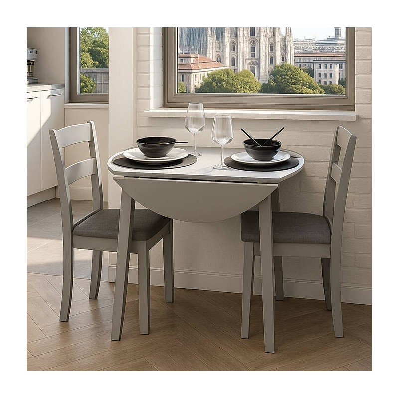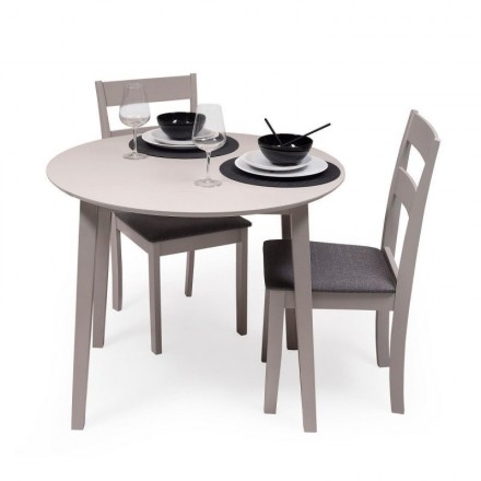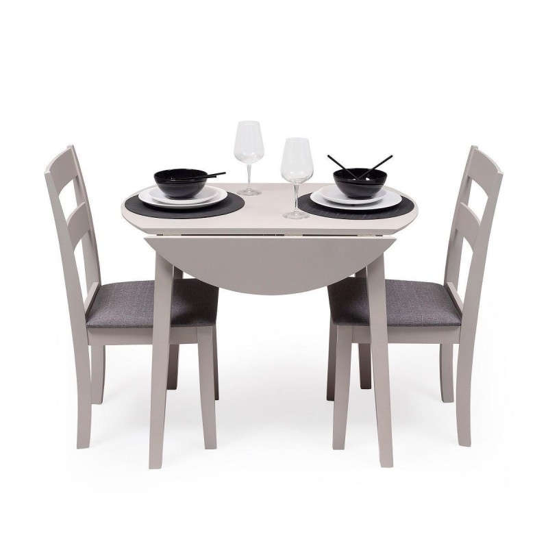 El conjunto DALLAS GREY está formado por una mesa extensible redonda, de madera lacada en gris, adaptable a tu espacio y tus necesidades, y dos sillas de comedor con estructura de madera lacada en gris y asiento acolchado tapizado en tela color gris oscuro.