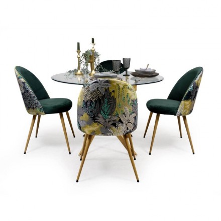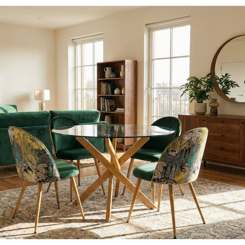 Este conjunto de comedor ha sido diseñado para quienes buscan un espacio elegante, actual y con un marcado carácter decorativo. Está compuesto por una mesa de comedor redonda con sobre de cristal templado y estructura de patas efecto madera, acompañada de sillas tapizadas en terciopelo verde oscuro con trasera estampada tropical a juego.