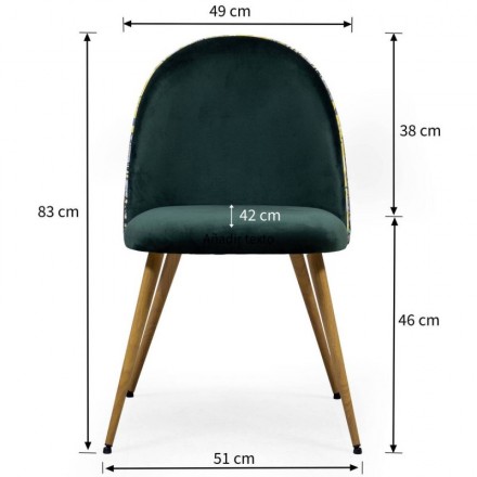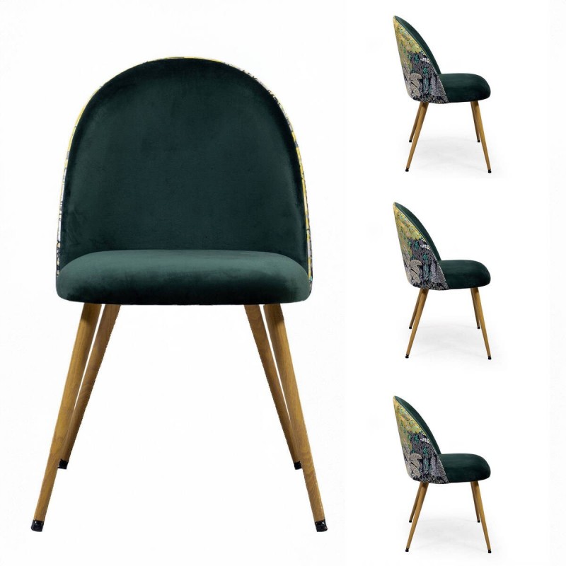 Las sillas destacan por su tapizado en terciopelo verde tipo verde botella, suave al tacto y visualmente sofisticado. Su respaldo curvo envolvente ofrece una sentada cómoda, ideal para el uso diario. El gran valor diferencial lo aporta la trasera en tela estampada de inspiración amazónica, con motivos botánicos que crean un contraste original.