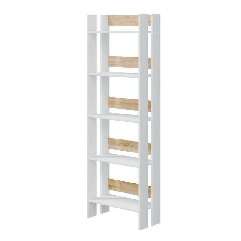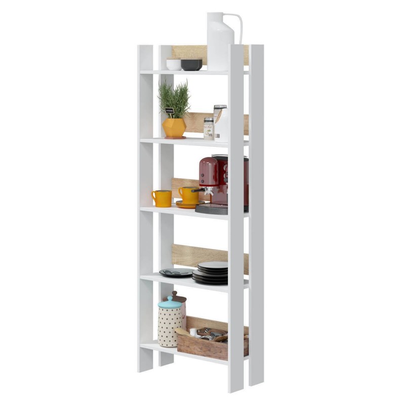 MADEIRA es una estantería alta de diseño nórdico en color blanco artik y roble canadian con cinco estantes creada para casas diferentes y con estilo.