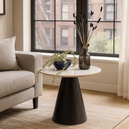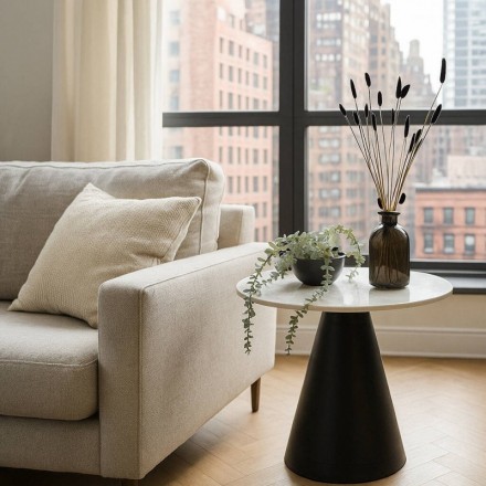 Lamesa auxiliar redonda Lúmica de estilo Minimal Soft es la combinación perfecta entre diseño contemporáneo y materiales exclusivos. La mesa de 50 cm de diámetro y 47 cm de altura , ofrece equilibrio visual y versatilidad.