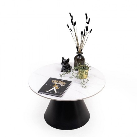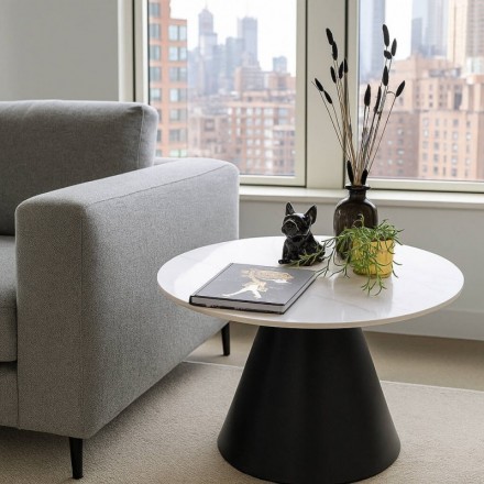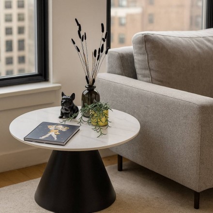 Su tapa porcelánica efecto mármol blanco aporta elegancia, sofisticación y resistencia, mientras que el pie central metálico aporta estabilidad y un estilo moderno de líneas limpias. Perfecta como mesa auxiliar colocada de manera independiente en distintos rincones, o junto a su hermana de 50 cm. Se adaptan a salones minimalistas, modernos o de lujo.