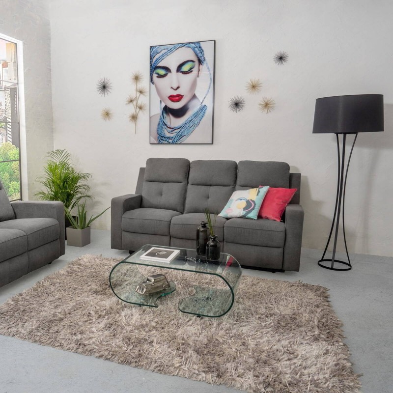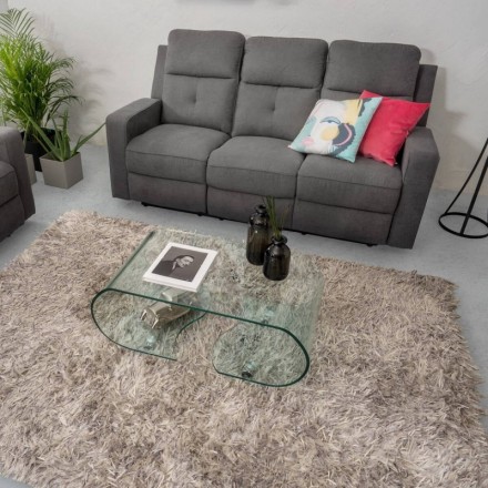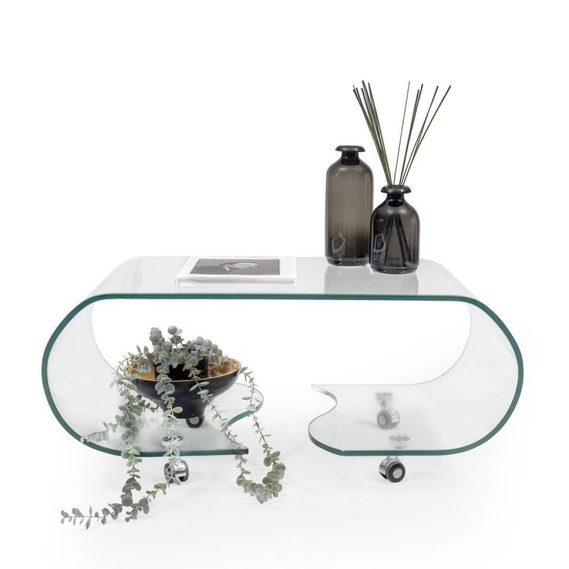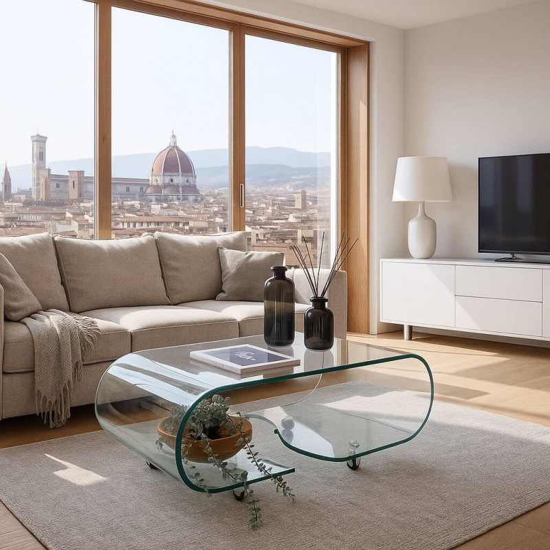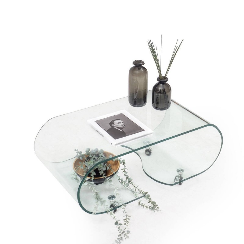 COFFEE es una mesa de centro de cristal curvado transparente de 12 mm de grosor.
